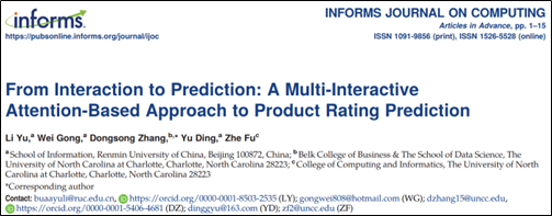 近日,巴卡漫画 经济信息管理系余力教授团队论文《From Interaction to Prediction: A Multi-Interactive Attention-Based Approach to Product Rating Prediction》在国际管理科学与运筹学顶级期刊INFORMS Journal on Computing(UTD期刊)上发表。第一作者为余力,论文合作者有其指导硕士生龚伟、丁雨,美国北卡大学夏洛特分校教授张东松、博士生傅哲。