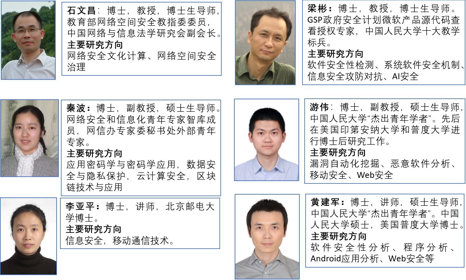 信息安全研究实验室成立于2008年,是由石文昌教授所领导的,主要开展以系统安全、代码安全和内容安全为基础的信息安全研究与实践的研究型实验室。实验室主要研究方向包括软件安全性检测、AI系统安全、区块链安全、云计算安全、网络安全文化计算等,在安全漏洞/缺陷检测、恶意代码分析、深度文本/图像分类器攻防、可管控数字货币关键密码学方法、新型跨链系统等领域取得了丰硕成果。实验室师生在国内外顶级期刊会议发表论文数十篇,并取得多项软件著作权登记与专利授权。