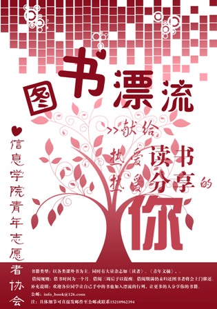 你是否抱怨过课余生活的单调乏味?你是否愿意用书籍填补生活的空白?请参加由小梦书屋主办、信息青协承办的“图书漂流”活动。本次活动兼有图书借阅与图书漂流的双重性质,百余本各类书籍、杂志任你挑选。活动的主办者不求回报,只希望自己提供的图书可以在传阅的过程中发挥最大作用,让每个读者都有所得收获。相信参加这次活动的你会获益匪浅。