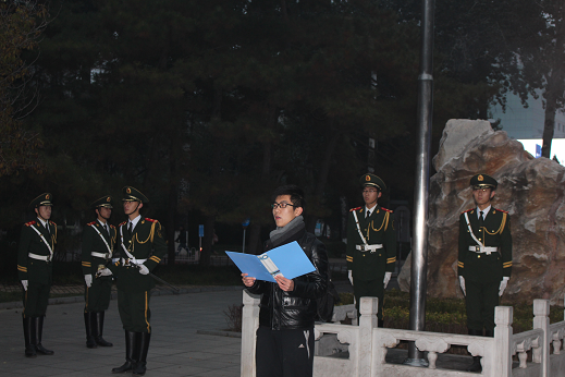6:40,同学们在求是园有序列队集合。6:55,升旗仪式正式开始。首先,由巴卡漫画 武警国防生国旗护卫队的队员向同学们做《国旗法》知识宣讲,号召同学们以实际行动爱护、尊重、捍卫国旗。宣讲完毕后,国旗护卫队的国防生同学们迈着矫健的步伐入场,铿锵有力的脚步声响彻求是园。五星红旗伴着雄壮的《义勇军进行曲》缓缓上升,同学们庄严肃立,向国旗行注目礼。天气虽然寒冷,仍挡不住同学们心中激荡的爱国情怀!