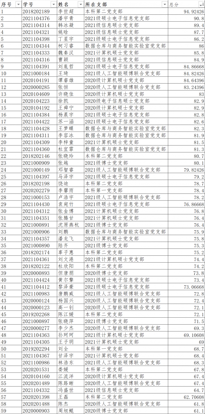为认真贯彻发展党员工作“控制总量,优化结构,提高质量,发挥作用”的方针,进一步加强对发展党员工作的民主监督,严把发展党员“入口关”,保证新确定入党积极分子的质量,根据有关要求,现对已参加学院第37期党校培训且单项、综合均考核合格的59名学员进行公示,以听取党内外群众意见。