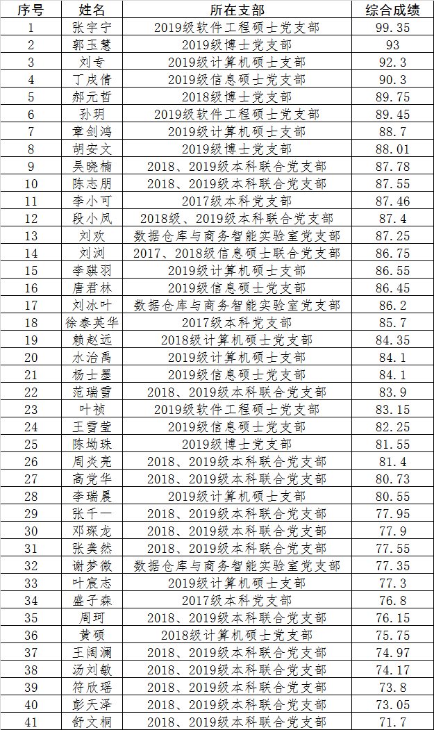 为了认真贯彻发展党员工作“控制总量,优化结构,提高质量,发挥作用”的方针,进一步加强对发展党员工作的民主监督,严把发展党员“入口关”,保证新发展积极分子的质量,根据学校党委组织部《关于在发展党员工作中实行公示制度的规定(试行)》,现对已参加学院第33期党校培训且单项、综合均考核合格的41名学员进行公示,以听取党内外群众意见。
