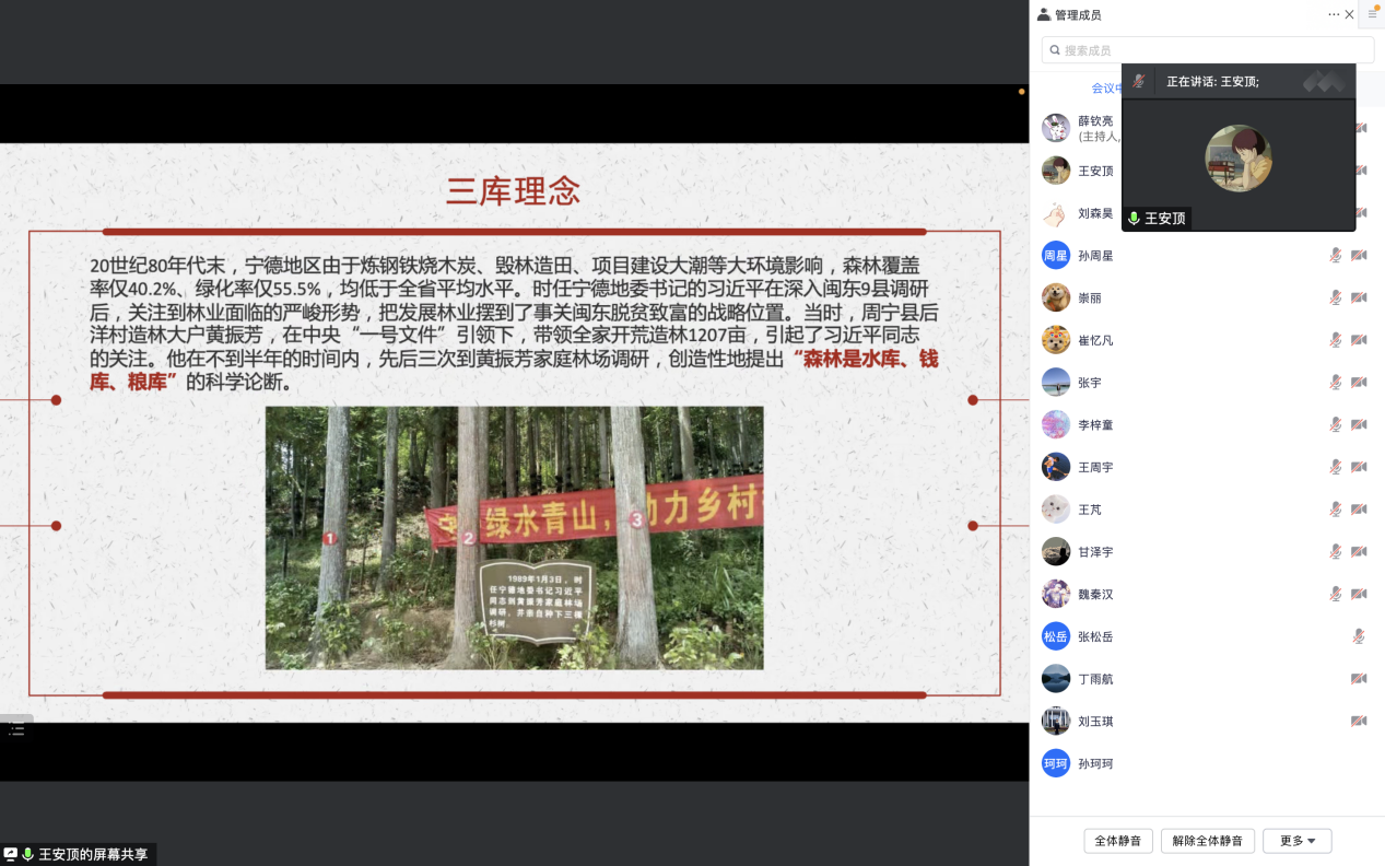 此外,王安顶同志还讲解了习近平总书记在福建闽东工作时提出的“三库理念”:森林是水库、钱库、粮库。2022年3月30日,习近平总书记在参加首都义务植树活动时,深刻指出:“森林是水库、钱库、粮库,现在应该再加上一个‘碳库’ ”;习近平总书记在海南考察调研时强调:“绿水青山是水库、粮库、钱库、碳库。”这些重要论述,赋予了“三库”理念新的维度、新的内涵。