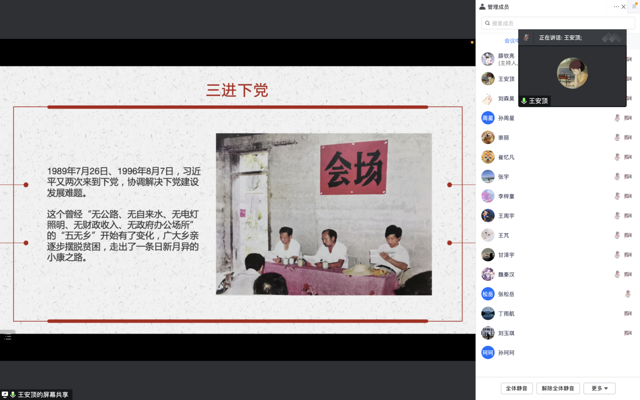 王安顶同志具体介绍了习近平总书记“三进下党”的故事。习近平总书记在福建工作期间,曾经三次到访下党乡,为这个曾经 “无公路、无自来水、无电灯照明、无财政收入、无政府办公场所”的“五无乡” 解决实际问题。在习总书记的努力下,开始有了变化,广大乡亲逐步摆脱贫困,走出了一条日新月异的小康之路。如今的下党乡风景秀丽,游人如织,成为了远近闻名的“学习小镇”,农民的人均可支配收入从1988年到2021年翻了100多倍。