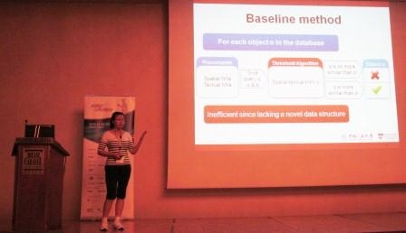 Sigmod会议涵盖数据库领域及相关领域(如信息检索)中各大研究方向。此会中,会议安排有21个部分,包含有Databases on new hardware, data integration, data privacy, parallel DB, cloud DB, spatial & temporal DB, data mining, information retrieval等。我们的文章解决的是基于Reverse k nearest neighbour query和Textual similarity search相结合而得到一种新的查询问题,属于Spatial & temporal database部分。