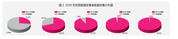 首先,从总体数据垄断现状来看,为详细阐明该数据收集现状,笔者根据获取权限数据的数量级对数据收集者进行划分,将获取1亿及以上权限数据的收集者定义为“亿级权限数据收集者”,获取1亿以下1千万以上权限数据的数据收集者定义为“千万级权限数据收集者”,并以此类推。主要结论如下:根据2019年总体数据收集状况,当前数据垄断形势严峻,极少数数据收集者垄断了绝大部分权限数据。2019年度数据垄断的“主力军”是占据所有数据收集者数量1%的“百万级、千万级、亿级的权限数据收集者”,他们可获取约92%的权限数据。对比2018年度与2019年度数据垄断状况,前10%的权限数据收集者获取的权限数据量占比略有减少,但总体上数据垄断态势居高不下。具体而言,不同级别权限数据收集者的数量与获取数据量的对比分布如图1所示,“百万级、千万级、亿级的权限数据收集者”本身的数量极小,但权限数据获取量均在10%以上,而其余大量的数据收集者可获取的数据量不足3%。该状况从不同比例数据收集者获取权限数据分布情况中体现得更为明显,如图2所示。表1给出2018年度与2019年度权限数据收集的对比情况,其变化量为负值说明这些权限数据收集者获取数据量占比有所减少,但权限数据收集者数量超过5%后,其获取数据量的变化微乎其微。可见,我国总体数据垄断形势依旧严峻。