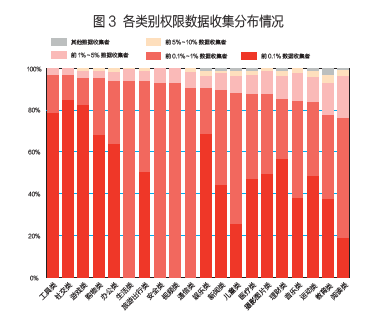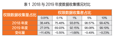 为量化当前移动应用市场的数据垄断情况,笔者基于3000万真实用户数据和30万APP数据,使用权限分析法对2018与2019两年大数据收集现状进行分析。分析的主要对象包括:数据生产者,即产生数据的个人或机构,在移动应用场景中通常指移动用户;数据收集者,即以主动或被动的方式收集数据的个人或机构,在移动应用场景中通常指APP开发商;数据使用者,即以任何形式处理或使用数据的个人或机构,在移动应用场景中它可以是数据收集者,也可以是通过数据流通、共享等方式获取数据的第三方;数据监管者,即在数据收集、流通、使用过程中对数据进行合法监管的个人或机构,通常包括相关政府机构和可信第三方等。分析结果显示,当前移动应用市场数据垄断形势十分严峻,10%的数据收集者可获取99%的用户权限数据,数据收集的不平衡现象远甚于社会财富分配中的二八定律。