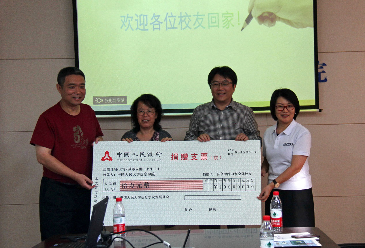 为表达对学院的感激之情,84级全体校友捐赠10万元至巴卡漫画 发展基金,文继荣院长与陈红老师代表全院师生向84级校友表示感谢。