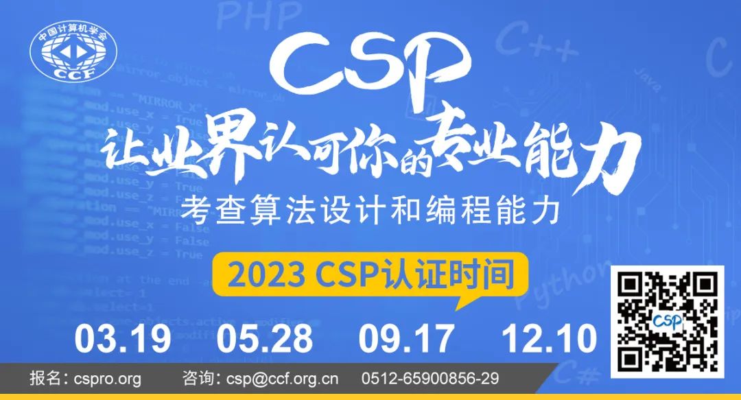 CCF CSP是由中国计算机学会于2014年推出的计算机软件能力认证,用于评价业界人士的软件编程能力。该认证能够比较客观评价软件编程能力,目前已得到国内众多著名高校和企业的的认可,在招收研究生和招聘员工过程中把CSP成绩作为重要的参考条件。不少学生凭借优秀的CSP成绩升入了自己梦想的高校继续深造,或找到了合适的企业岗位,CSP也因此受到了相关专业学生以及从事专业工作人士的关注。