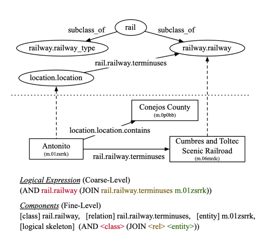 知识库问题回答(KBQA)旨在提供一种用户友好的方式,通过自然语言访问大规模的知识库(KB)。为了回答复杂的自然语言问题,一种KBQA方法基于语义分析(SP-based KBQA),并在i.i.d.数据集上取得了较好的结果。这种基于SP的方法首先将问题翻译成逻辑表达式,如SPARQL,然后在KB上执行这些表达式以得到最终答案。然而,大部分SP-based KBQA存在泛化问题,即当逻辑表达式中包含训练集中没有出现的知识时准确率较低。我们认为,泛化问题主要是由于现有方法在建模时将逻辑表达式看作是不可分割的单元。但实际上,逻辑表达式是粗粒度的,可以被分解成相对细粒度的知识成分,包括关系、类、实体和逻辑骨架,如下图所示。