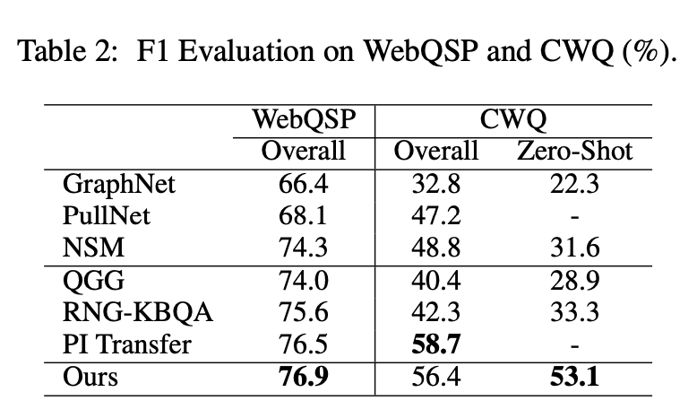 我们的模型在泛化数据集GrailQA以及i.i.d.数据集WebQSP, CWQ上都取得了较优的效果。