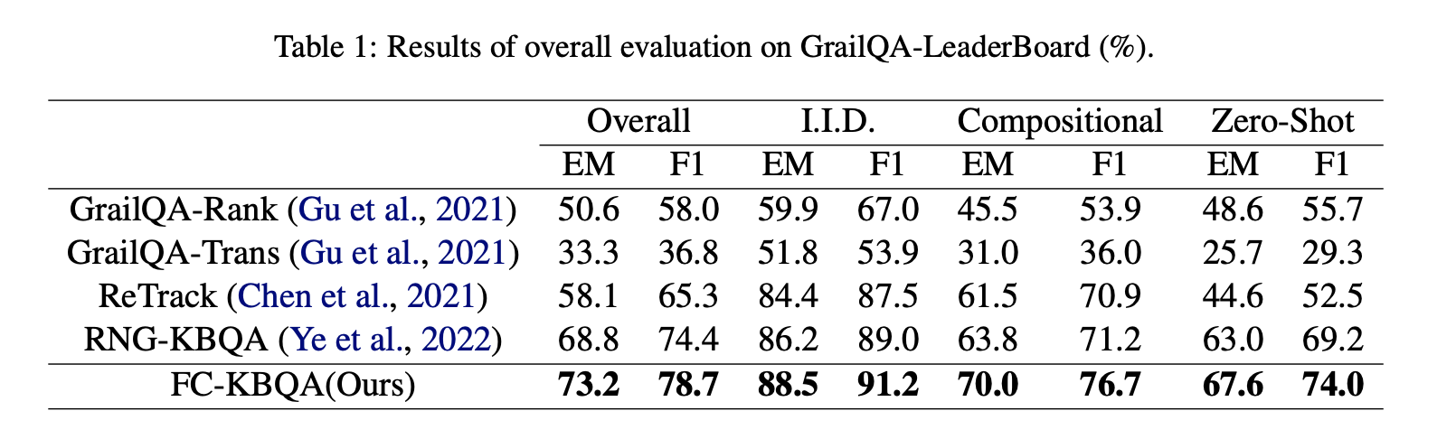 KBQA的泛化问题已经引起了广泛的关注。现有的研究普遍对逻辑查询表达式(例如SPARQL)进行粗粒度建模,导致逻辑表达式中的知识表征耦合在一起,从而带来泛化问题。本文提出了一个从细粒度到粗粒度建模的KBQA框架FC- KBQA,在确保逻辑表达式泛化能力的同时保证可执行性。FC-KBQA的主要思想是,从知识库中提取相关的细粒度知识成分,并将其按照KB约束组合为连通的中粒度知识对,最后用生成模型生成最终的逻辑表达式。FC-KBQA在GrailQA和WebQSP上获得了较好的表现,同时也保证了较快的运行速度。