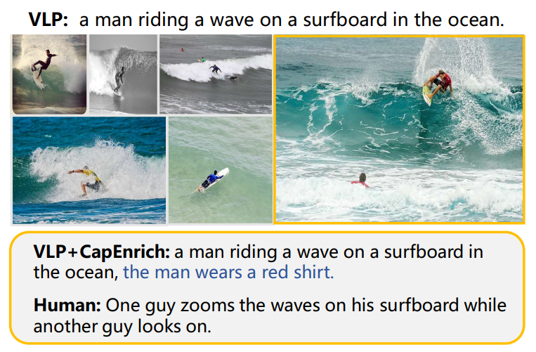 自动为互联网上的大量无标签图像生成文本描述,可以有效辅助多模态检索、推荐等实际应用。然而,现有模型普遍存在生成文本过于“笼统(over-generic)”的问题,即它们倾向于为不同的图像生成雷同甚至重复的简单句子。最先进的基于视觉-语言预训练的模型也无法避免该问题,例如上图中,VLP模型为6张图片生成相同的句子“a man riding a wave on a surfboard in the ocean”。考虑到互联网上图像的多样性,这些笼统的文本不能提供充分的语义信息。本文的目标是自动为图像生成包含更多视觉细节的文本。