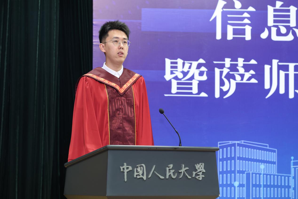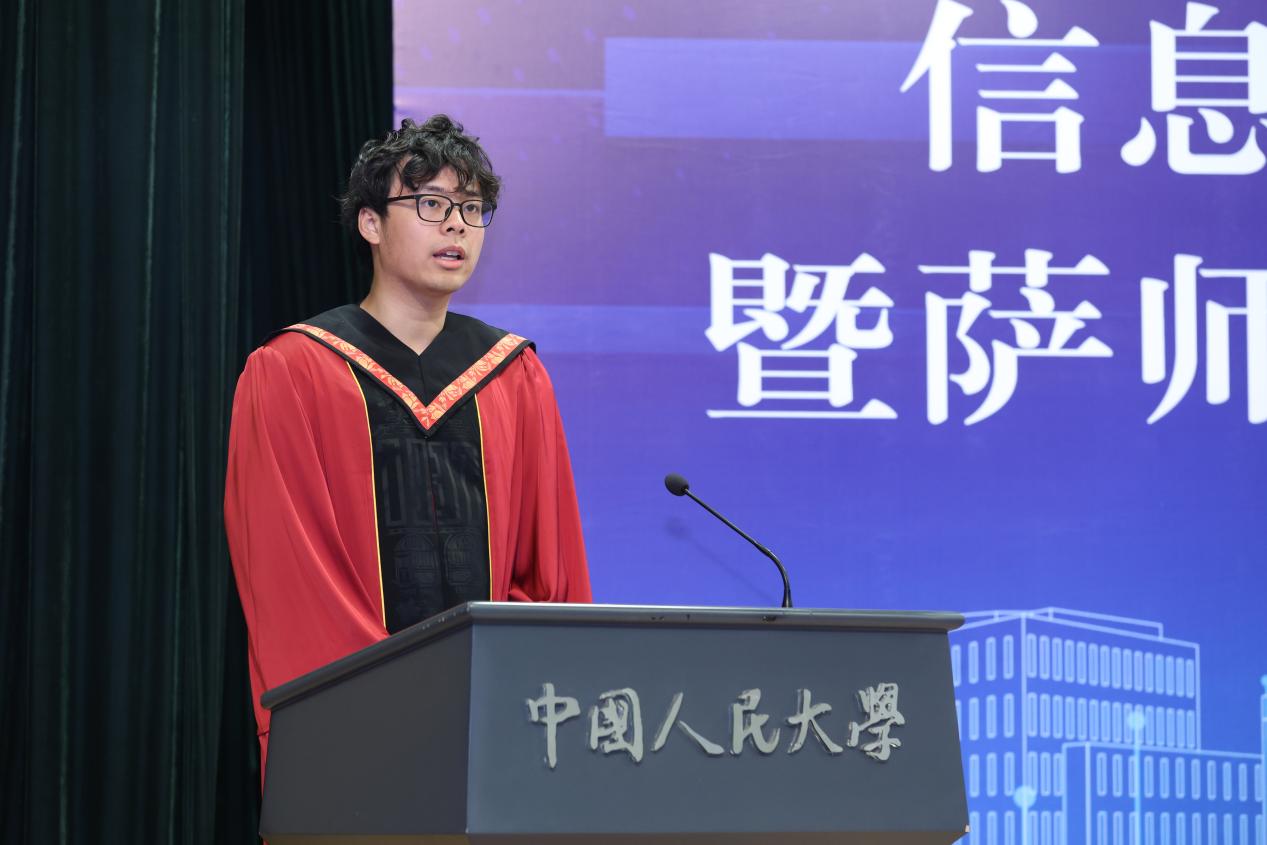 研究生毕业生代表杜启翰在发言中提到,“学院的培养、师长的帮助、挚友的鼓励,给予我勇往直前的力量”,从理工配楼下星辉斑斓的夜到人大东门外晨曦初露的晨,实验室里通宵达旦的每个日夜、第一次论文被接收时的心潮澎湃、教二草坪盛夏时节的人潮熙攘,都令他难忘。他说,五年时光,巴卡漫画 教会他要敢为人先,以天下为己任,在仰望星空中融入“大我”,成就“小我”;教会他要实事求是,以真理为追求,在面向未来中探索“未知”,开启“真知”;教会他要知行合一,以务实为底色,在脚踏实地中追寻“初心”,积极“行动”。他将始终镌刻“实事求是”的人大基因,秉承“信火相传”的优良品格,牢记“立学为民、治学报国”的精神使命,扎根基层发光发热,在青春的赛道上奋力奔跑,争取跑出当代青年的最好成绩。
