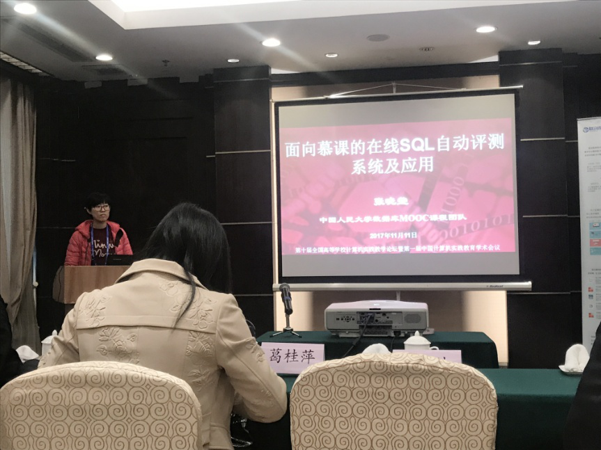 会后,多个高校数据库老师对报告中提到的数据库系统概论实验评分系统表达了强烈的兴趣,纷纷前来咨询,并表示该系统解决了传统数据库实验教学中纯手工、粗粒度批改实验的难题。该系统由我校数据库课程教学团队研发,作为“数据库系统概论”MOOC课程的在线实验支撑工具,不仅实现了自动、实时、细粒度地评判学生实验成绩,还为授课教师提供了对实验成绩、实验过程的多角度分析,帮助教师及时掌握学生的学习情况。目前,该系统免费向高校开放,已有10余所高校申请使用。