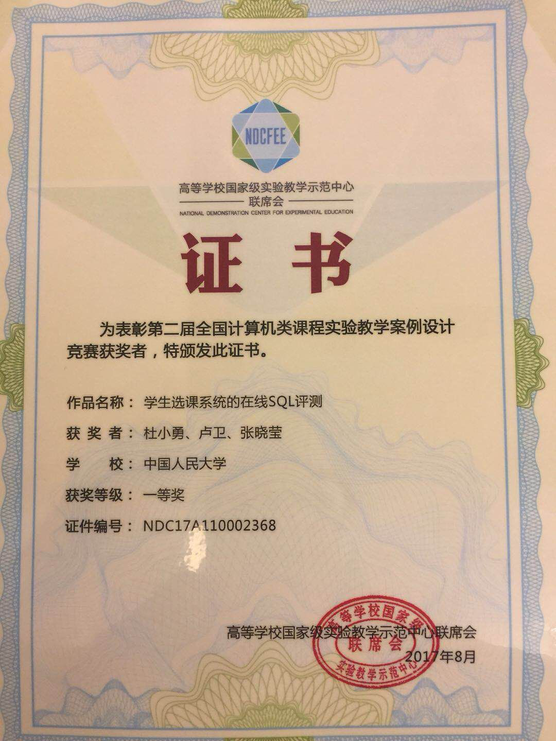 由杜小勇教授、卢卫副教授和张晓莹老师提交的的实验教学案例"学生选课系统的在线SQL评测"荣获“第二届全国计算机类课程实验教学案例设计竞赛”一等奖,由张晓莹老师、卢卫副教授、杜小勇教授以及硕士生程一舰、赵展浩共同撰写的论文“面向慕课的在线SQL自动评测系统及应用”荣获优秀会议论文。