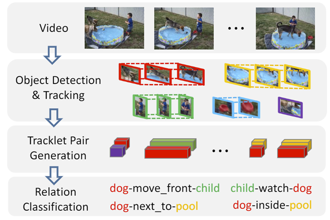 我们通常用 <主体,动作,客体> 这种三元组的形式来表示日常生活中物体对之间的关系,比如 <人,骑,马> 这样的动作,由此产生了“视频关系检测”这样一个视觉任务,它要求模型检测出一个视频里每一对关系所属物体和动作类别,以及它在时间和空间上的位置。该任务能够帮助机器更好地理解视频的场景内容。