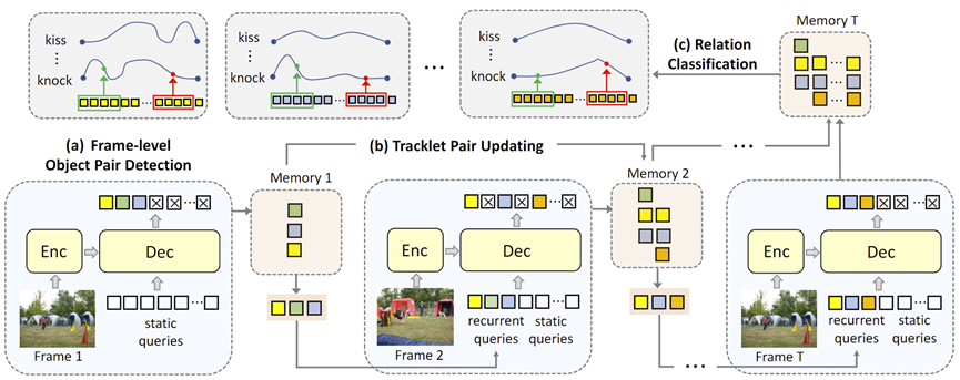 对于多帧视频,我们将不同帧的物体关系在时序上进行串联,可以得到时序上的轨迹关系对变化情况,这一过程与目标跟踪相仿。为了限制query处理的数量,我们受启发于trackformer工作,将query分成两个部分:固定数量的static query用于单帧的物体关系对检测,然后我们根据阈值筛选出我们觉得比较可能存在关系的query,作为recurrent query送到下一帧,和下一帧的static query一起作为解码器的输入,整个过程是自回归的,如上图所示。通过限制recurrent query的数量,我们每次要处理的query数就显著下降了。同时,在自回归迭代的过程中,筛选出的query vector会被作为轨迹关系对的memory进行保存,在对整个视频检测完毕之后我们再用这些memory进行关系分类。