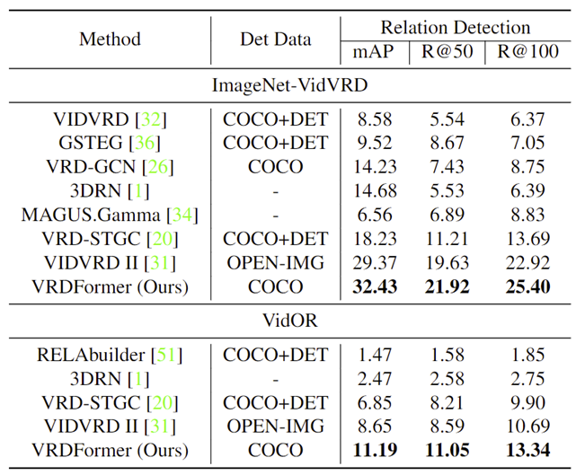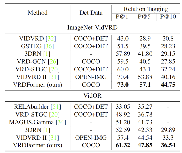 我们在该任务两个传统的数据集VidVRD和VidOR上分别做了relation tagging和relation detection两个子任务的实验,并都取得了最佳效果。