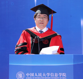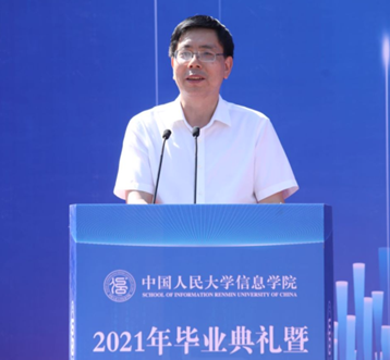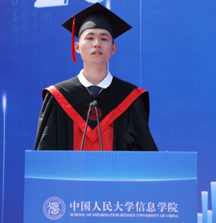2021届本科毕业生代表唐天一同学发言。他代表本科毕业生向学院和学校的关爱与教诲表示衷心的感谢,并表示同学们将会恪守“立学为民,治学报国”的初心情怀,秉承着学院“开信息之先河”的宏伟气魄,在未来的学习、工作和生活中持续以“人大人,信息人”的标准严格要求自己,在奋斗中成就自我、回馈社会。