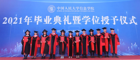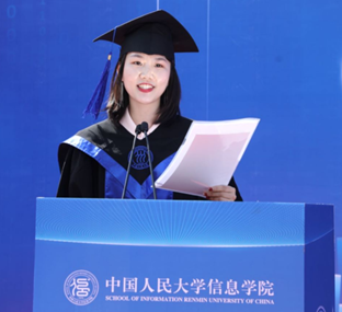 2021届硕士毕业生代表陈韵飞同学发言。她与大家分享了自身在人大度过的七年青春时光,从青涩懵懂到成熟稳重,离不开学院的栽培、老师的教导和同学的关爱,并代表研究生毕业生向学校和学院表示感谢。她祝福全体毕业生能够带着“实事求是”的人大基因,传承“信火相传”的信息精神,走向更加光明与精彩的未来。