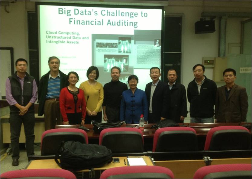 2013年10月23日,应梁循教授和方美琪教授邀请,美国伊利诺伊大学芝加哥分校信息与决策科学系Christopher Westland教授访问巴卡漫画 ,并在信息楼四层学术报告厅做了题为“Big Data’s Challenge to Financial Auditing---Cloud Computing, Unstructured Data and Intangible Assets”的精彩报告。报告会由方美琪教授主持,巴卡漫画 信息系主任梁循教授、陈禹教授、王伟教授、杨波副教授、余力副教授、王明明副教授、付虹蛟副教授、对外经贸大学殷国鹏副教授以及学院的40多名博士生和硕士生参加了报告会。与会师生对报告内容表现出了极大兴趣,并就相关问题与Westland教授进行了深入的探讨和交流。本次报告是巴卡漫画 主办的“信息讲坛”系列讲座之一。