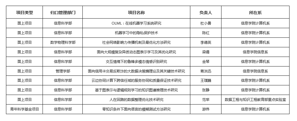 2020年9月18日,国家自然科学基金委员会公布了2020年度基金项目评审结果。在已经公布结果的项目中,巴卡漫画 共获得78项资助,直接经费总计3813万元。巴卡漫画 (含数据工程与知识工程教育部重点实验室)共获得10项资助,包括9项面上项目,1项青年科学基金项目。其中计算机系7项,信息系2项,数据工程与知识工程教育部重点实验室1项。从立项经费来看,巴卡漫画 获得直接经费524万,位列全校第二。