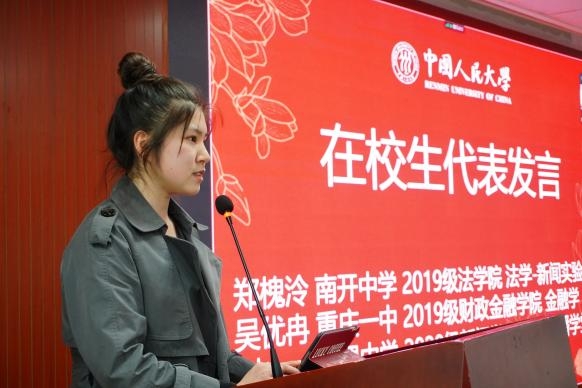 2021级本科新生代表经济学院王佳豪、强基计划古文字专业赵苗豆和中法学院朱婉琦三位同学分享了他们初入人大的学习生活感受。王佳豪同学从“不一样的大学生活”谈起,表示在来到人大、接触来自各地的同学后,其眼界变得更加开阔。深刻的新生入学教育、多样的校园活动也加深了他对“人大人”身份的认同感;赵苗豆同学则结合其“强基计划”经历,分享了自己从录取、报道到入学的全过程。幽默、接地气的发言传达出她对大学生活的期盼;中法学院朱婉琦同学用“温暖”、“热爱”、“未知”、“全面”四个词概括了自己初入校园的感受,她总结到,开启大学的新篇章或许迷茫无措,但一定未来可期。