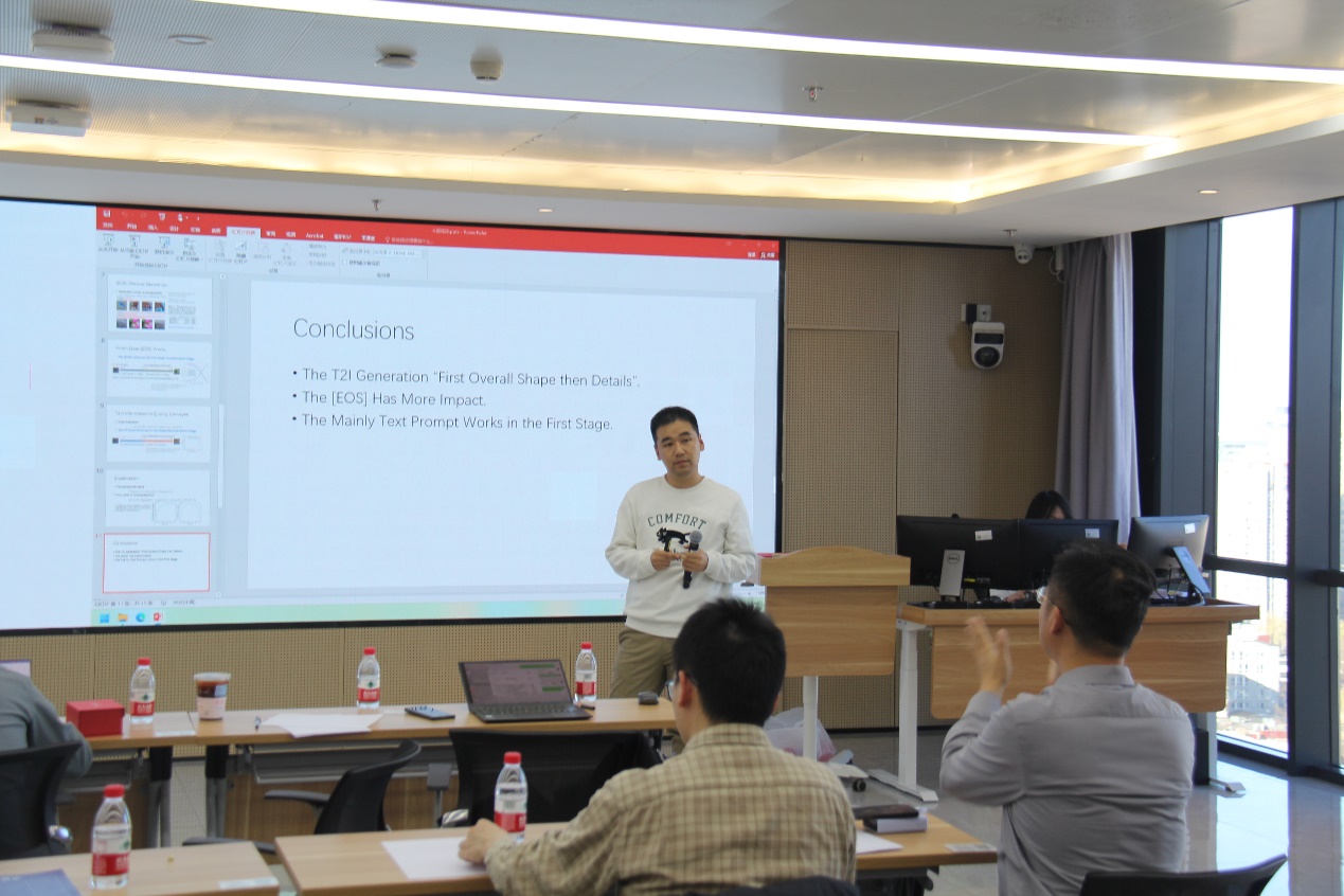易鸣洋老师则在报告中深入剖析了文生图扩散模型的生成机制。他介绍了一种创新的图像生成方法,将自然语言生成(NLG)与图像生成技术相结合,通过引入语义理解和图像语义一致性控制机制,生成了具有更高语义准确性的图像。易老师的研究在多模态学习和图像生成领域具有广泛的应用前景,尤其是在图像修复和跨模态数据交互等方面,展现了巨大的潜力。