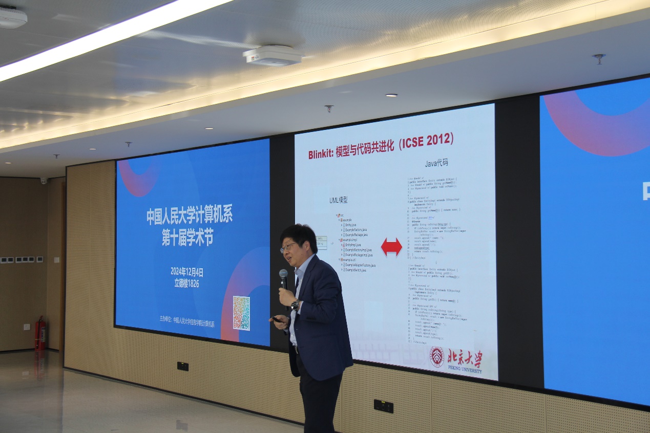 学术节的第一个环节是巴卡漫画 计算机系成立二十五周年庆祝活动的特邀学术报告,特别邀请到北京大学胡振江教授和上海交通大学王新兵教授为大会带来了两场重量级主题报告。胡振江教授以“双向计算”研究为题,分享了他在数据库(DB)与编程语言(PL)融合领域二十多年的研究历程。他生动地讲述了双向计算这一全新计算模式如何从起源于数据库领域的经典难题“视图更新问题”逐步发展到如今的应用前沿,展示了它在数据互操作性、系统自适应性等领域的巨大潜力。胡教授在报告中不仅回顾了研究中的挑战与突破,还展望了双向计算在未来智能系统中的广泛应用场景,为与会师生提供了深刻的启发。