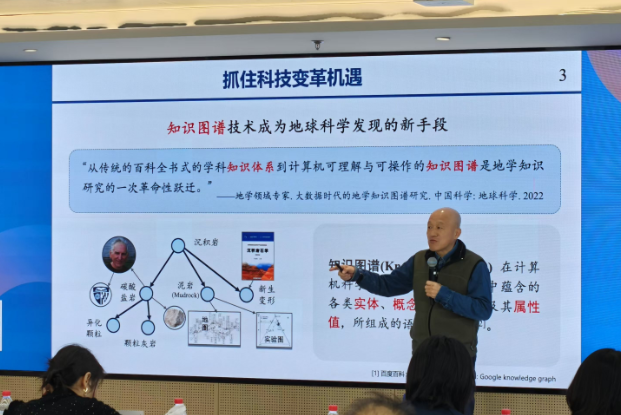 之后,上海交通大学王新兵教授以“地学知识图谱”为题,讲述了知识图谱技术在智能时代的重要性和应用潜力。他详细介绍了如何通过图文数一体化技术实现知识的提取、表示和推理,并通过自己开发的ACEMAP系统展示了知识图谱在科研和社会实际中的价值。他强调,构建高效的知识系统和交互平台是推动知识图谱技术发展的核心,同时也分享了他的团队如何在复杂的科研环境中实现目标的经验。