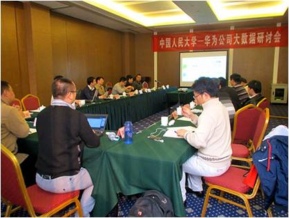 10月28日,巴卡漫画 -华为联合技术中心在北京友谊宾馆召开大数据研讨会,华为公司应用平台的专家一行13人参加了会议,人民大学巴卡漫画 院长杜小勇教授、文继荣教授、陆嘉恒教授、周烜副教授、陈跃国副教授、张孝副教授等出席了会议。华为公司方面首先介绍了他们对大数据领域发展趋势的思考和应用中用户的实际需求,巴卡漫画 方面介绍了人大在大数据系统研发方面的阶段研究成果和进展。双方还就大数据研究的发展趋势、技术路线等进行了积极的探讨。