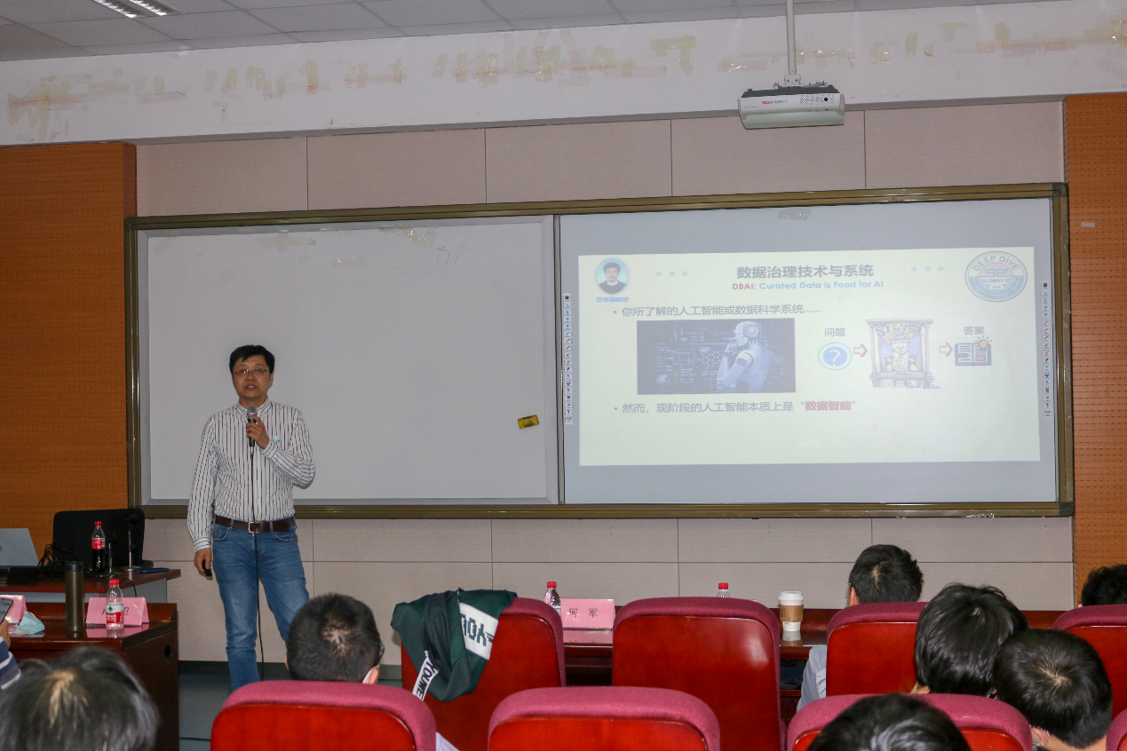 范举老师将自己的研究方向概括为“数据治理技术与系统”,为大家讲述了人工智能背后所依赖的算法与数据。他重点介绍了数据质量在人工智能研究中的重要性和小组为了解决这一痛点目前产出的成果,并阐述了其小组的研究重心:数据准备及提升数据质量。