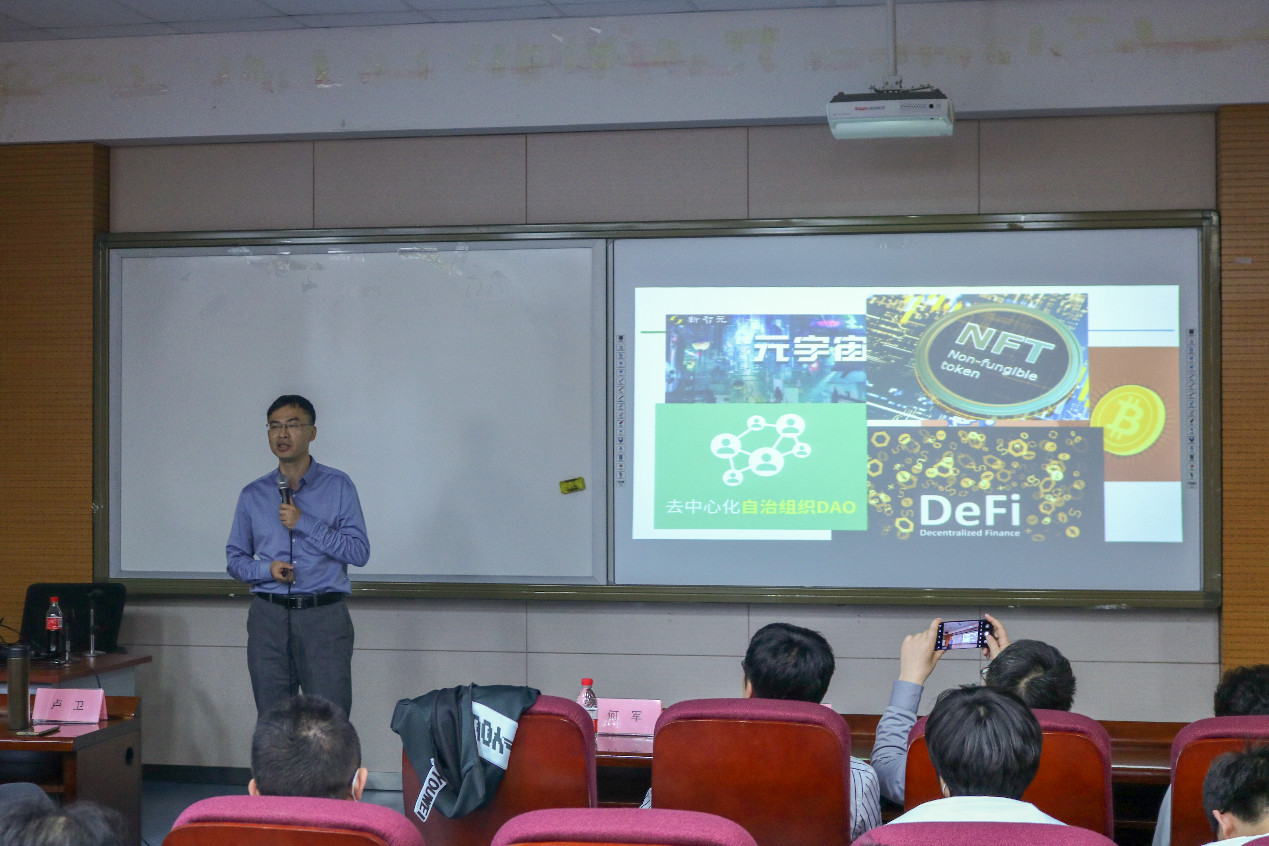 “喧嚣的背后,坚守安静的科研”是陈晋川老师在研究区块链过程中一直坚持的理念。陈晋川老师结合现在热门的DeFi、NFT、元宇宙等话题,为同学们详细地讲述了区块链的概念和广阔的应用前景。