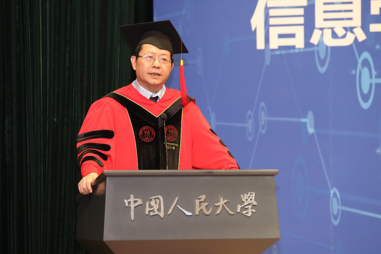 王利明常务副校长代表学校致辞,他代表学校送给毕业生们三句话,一是期待毕业生们敢为人先,把握时代发展的脉搏,二是期待毕业生们自信立身,展现人生独特的价值,三是期待毕业生们不忘初心,坚守人生前进的方向,成为无愧于时代、无愧于国家的“国民表率、社会栋梁”。