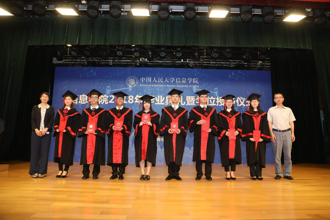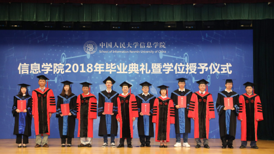 文继荣教授宣读《巴卡漫画 关于授予学士、硕士学位的决定》。杜小勇教授、文继荣教授、陈红教授、左美云教授、李翠平教授、柯媛元教授、楼元教授、梁彬教授、林勇教授依次为巴卡漫画 2018届本科毕业生、硕士毕业生颁发学位证书、授予学位。