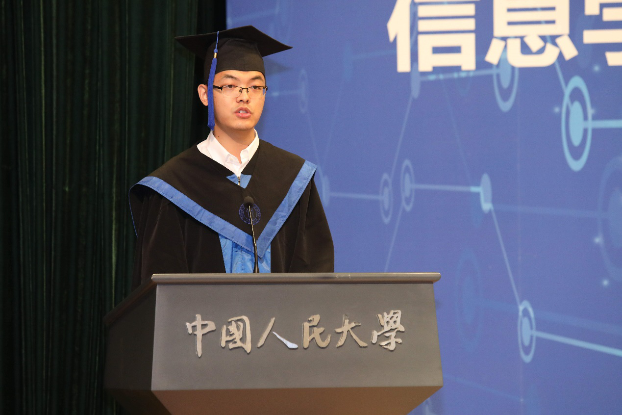 2018届硕士毕业生代表黄斐然、赵歆悦同学分别发言。黄斐然分享了他在人大生活的三个“最”,最珍贵的收获、最真挚的感谢以及最精彩的未来,并祝福全体毕业生能够拥有光明的前途和宽广的道路,牢记自己是“国民表率,社会栋梁”。赵歆悦同学分享了她在人大7年来的点点滴滴,并感谢学院的培养和教育、老师的关爱与教诲、家人的付出与支持,以及同学带来的快乐与帮助。