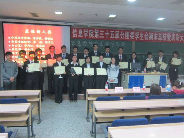 紧接着的是大会的部门展示环节。首先是追求卓越的分团委宣传部,凡是有关信院的活动,都能看到团宣人用相机和笔记录着点点滴滴;团结友爱的分团委组织部,新生爱国主义教育、参观首博、先进班集体评选等活动都由他们一手承办;脚踏实地低调做事的办公室,他们认真负责的后勤工作保证了每一次活动的顺利召开;务实友爱的实践部,他们吃苦耐劳,在129排练过程中为同学们送上温暖的慰问品,承载着实践部同学们对信院大家庭的爱;充满活力的体育部,他们充满朝气,又不乏细腻的工作组织,让信院的所有同学都能积极的投入到各项体育活动之中。随后我们又认识了忙碌而无悔的外联部,正是他们的付出让巴卡漫画 的活动丰富多彩;辛勤付出的文化部,“一二·九”合唱比赛的完美演出他们功不可没。宣传部以“非诚勿扰”的节目形式向大家进行了展示,每周定期发送的手机报也让信院家庭更加温暖。最后,学习部模拟新闻联播的形式向大家介绍了ACM大赛、信手相连辅导等务实的助学活动。