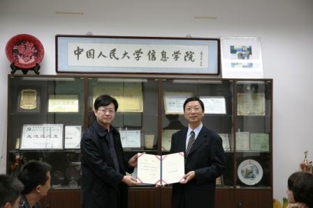 10月17日上午,英国雷丁大学(University of Reading)信息科学研究中心主任刘科成教授受聘巴卡漫画 客座教授仪式在信息楼二层会议室隆重举行。仪式由主管国际交流的巴卡漫画 副院长左美云教授主持,学院院长杜小勇教授代表学校为刘科成教授颁发了纪宝成校长签发的客座教授聘书,并热烈欢迎刘教授加盟巴卡漫画 ,进一步促进学院之间尤其是与经济信息管理系之间的交流合作。巴卡漫画 党委书记林颐老师、巴卡漫画 前院长陈禹教授、经济信息管理系党支部书记梁循教授、副主任杨波副教授、商学院管理科学与工程系主任王刊良教授以及巴卡漫画 部分教师和博士生、硕士生也参加了此次受聘仪式。
