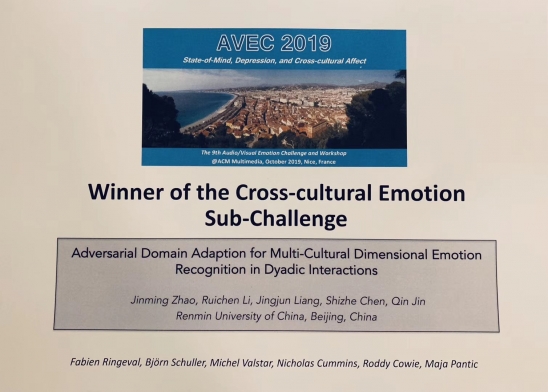 除了论文成果外,金琴副教授团队在此次大会承办的挑战赛上也收获颇丰。在情感计算领域最重要的国际挑战赛AVEC上,团队继2017年以来第三次获得冠军。今年的情感识别挑战赛难度再次升级,要求在无监督条件下进行跨文化的连续维度情感识别。在38支参赛队伍中,金琴副教授团队是唯一考虑跨文化的影响,提出针对目标文化进行跨域适应模型的队伍,并以优异的比赛成绩验证了模型的有效性。