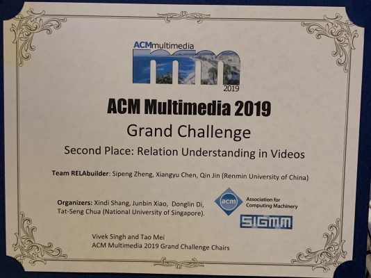 10月21-25日,多媒体领域顶级国际会议ACM Multimedia (ACM MM) 2019在美丽的法国南部城市尼斯举行。金琴副教授团队共发表三篇长文,并受邀做论文报告。除此之外,团队还在Audio-Visual Emotion Challenge (AVEC) 和 Relation Understanding in Videos Grand Challenge两项挑战赛上分别取得了第一名和第二名的好成绩。