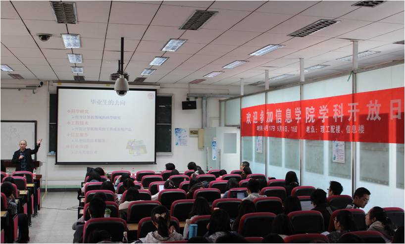 开放活动分为学术讲座和实验室参观两个部分。在讲座上,计算机系系主任石文昌教授首先介绍了巴卡漫画 计算机系的发展概况和历史沿革,并重点分析了巴卡漫画 计算机系的学科水平和学科特色。石文昌教授鼓励各位本科生充分利用计算机系的优越资源,找到自己的科研兴趣,积极投身计算机科学研究,将所学运用于实践。之后,八个实验室团队的代表老师依次上台为大家介绍了各自实验室的研究方向、研究成果和实验室特色。台下的同学们认真聆听,对实验室的工作和生活有了初步的了解。