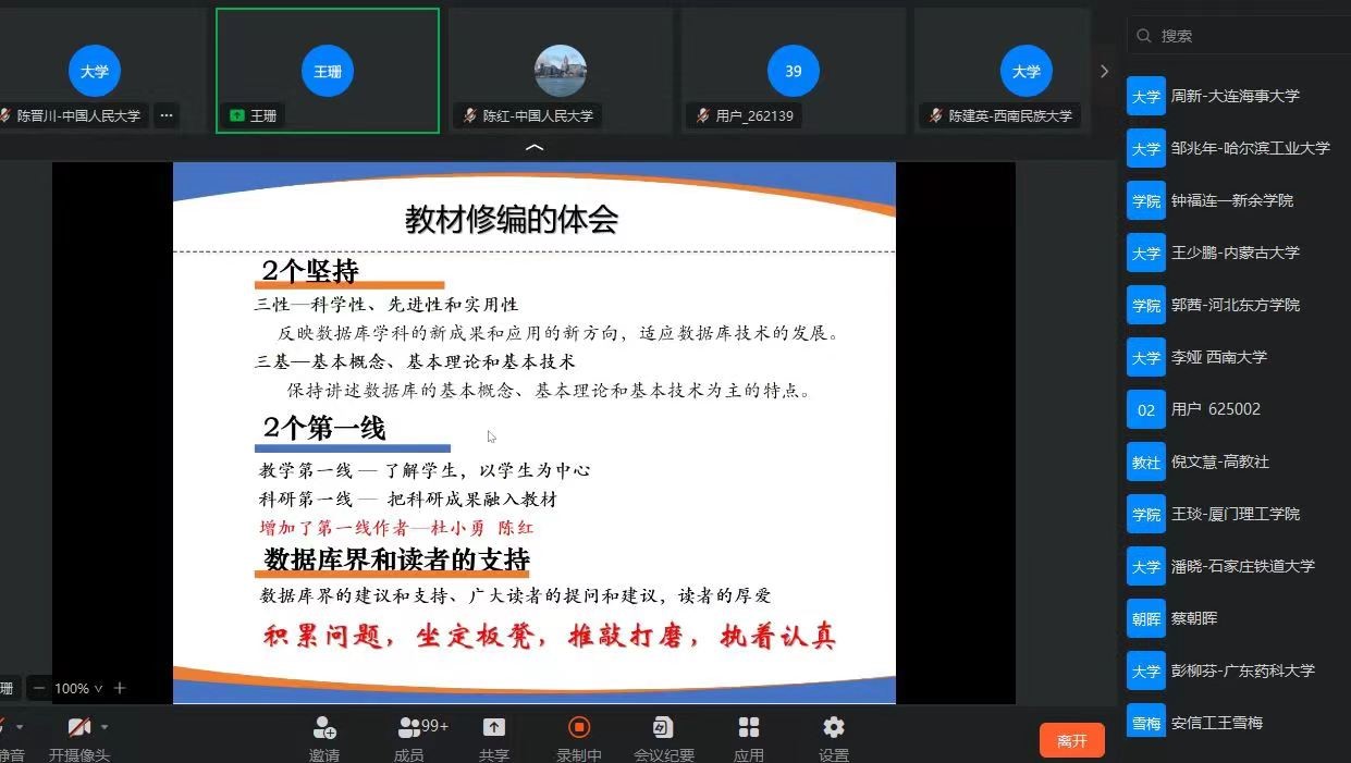 王老师还谈了教材修编的体会:2个“坚持”和2个“第一线”。坚持教材的科学性、先进性和实用性,坚持讲述数据库的基本概念、基本理论和基本技术为主的特点;教材的编者既要在教学第一线,以学生为中心,又要在科研第一线,把科研成果融入教材。此外,一本好的教材离不开数据库届和读者的支持。会上,王老师与参会的数据库教师进行了亲切交流。