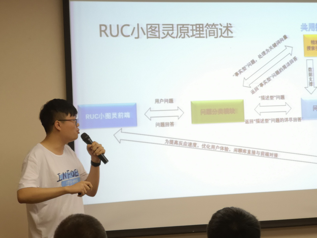 座谈会期间,由2017级图灵班几位同学组成的团队向参会人员介绍了他们研发的微信问答机器人“RUC小图灵”,并进行积极互动,现场气氛非常热烈。