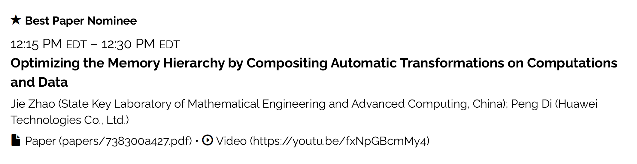 在服务社会需求方面,赵捷老师长期与国内企业深度合作,致力于推动中国自主知识体系的学理化和系统化建设,为包括申威国产自主高性能处理器、华为昇腾AI芯片等国产自研芯片的国产化自主软件设计做出了贡献。在将相关研究成果形成论文发表在国际顶级期刊和会议的同时,赵捷老师还将相关研究成果撰写成教材《多面体编译理论及其深度学习实践》,是深入介绍多面体编译技术的第一本中文系统教材,为我国培养编译器设计与实现相关从业人员奠定了一定的基础。赵捷老师目前还担任华为昇思MindSpore技术委员会委员等职。