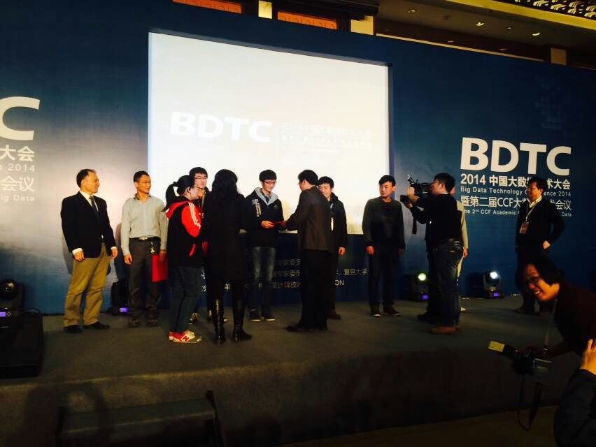 在刚刚结束的第二届中国大数据技术创新大赛中,来自巴卡漫画 数据库与智能信息检索实验室(DBIIR)的DBIIR参赛队和多媒体计算实验室(MMC)的RUC_Navigator参赛队分别以赛题第一名和第二名的优异成绩获得二、三等奖。颁奖仪式在2014年12月13日上午中国大数据技术大会的首日全体大会上隆重举行,现场有来自国内外学术和工业界的参会嘉宾1500多人。队长卞昊穹、陈师哲分别代表人大两支参赛队登台领奖。在12月14日中国大数据技术大会专题会场上,卞昊穹代表参赛队报告了本队的互联网日志大数据存储解决方案,与在场的大数据企业和其他参赛队进行了技术交流。