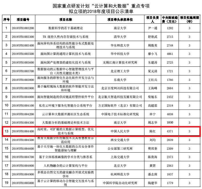 近日,从科技部获悉,国家重点研发计划“云计算和大数据”重点专项拟立项的2018年度项目公示中,由巴卡漫画 牵头承担的高时效、 可扩展的大数据计算模型、 优化技术与系统(共性关键技术类) 项目负责人为巴卡漫画 陈红教授,此项目中央财政拨款经费4371万元,位居榜首,项目实施周期为3年。