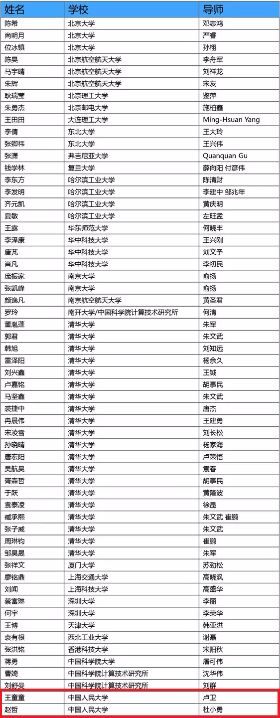 腾讯犀牛鸟精英人才培养计划(俗称小犀牛鸟计划)始于2017年,是一项面向学生的校企联合培养方案,旨在加强与高校、科研机构的跨界联动,定制顶尖科技创新人才培养方案。为了给更多学生提供更为广阔的学习环境,本年度还首次面向高年级本科生开放,涵盖AI医疗、量子计算、机器学习、计算机视觉、语音技术、自然语言处理等产学研热点方向。2018年该精英人才培养计划发布后,引起国内外学生的广泛关注和参与,共收到来自50余所高校的160余名优秀学生的申请,最终有58名学生入选。附入选名单如下。