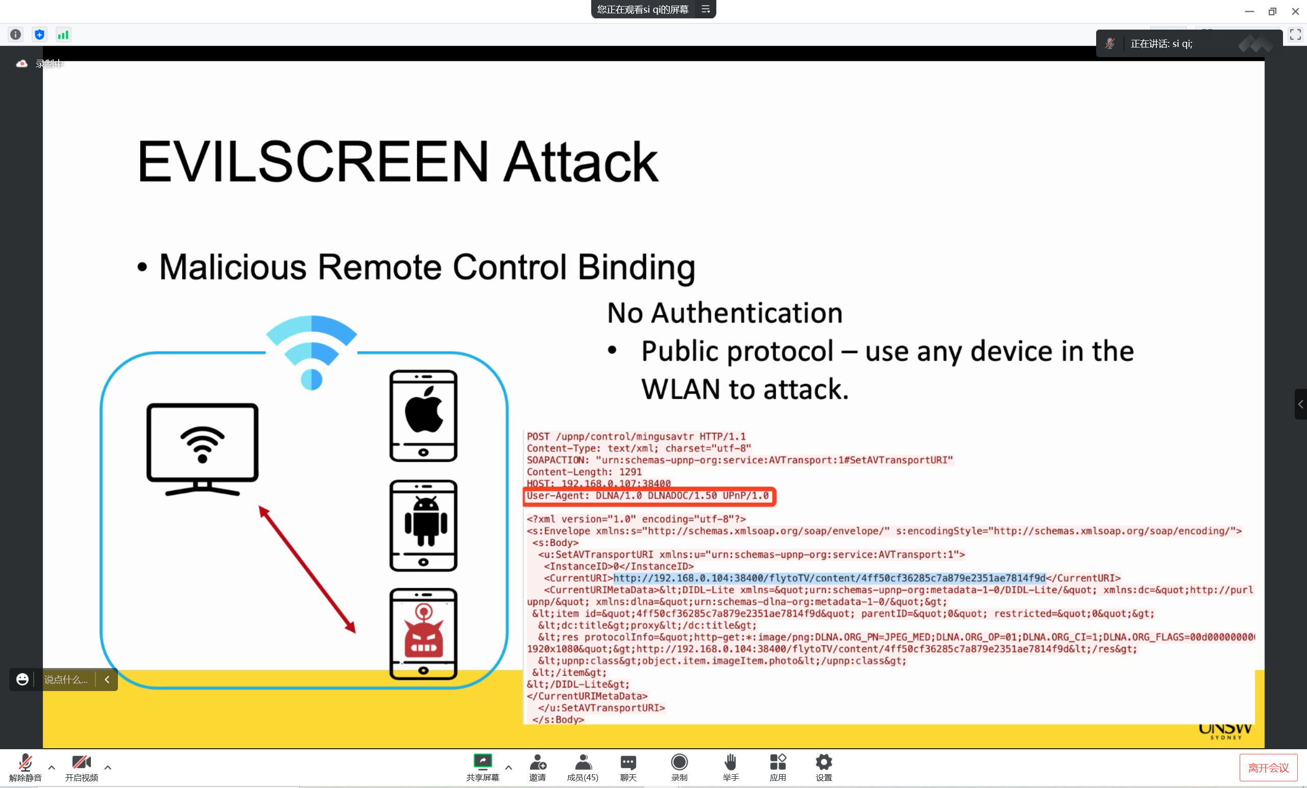 以家用智能设备中的恶意远程控制为例,常见的存在安全漏洞的认证方式包括任意设备都可连接的无认证方式、通过不安全的网络信道进行的pincode认证,明文进行的用户名和密码认证等。这些常见的认证方式都存在被攻击的安全隐患。攻击者只需要截取正常用户发送给电视的网络信息协议,再分析对应的内容,就可以获得pincode或者明文的用户名密码等信息,从而将自己的设备连接到电视,完成远程攻击。经过实验验证,几乎所有常见品牌的电视都存在不同程度的安全问题。
