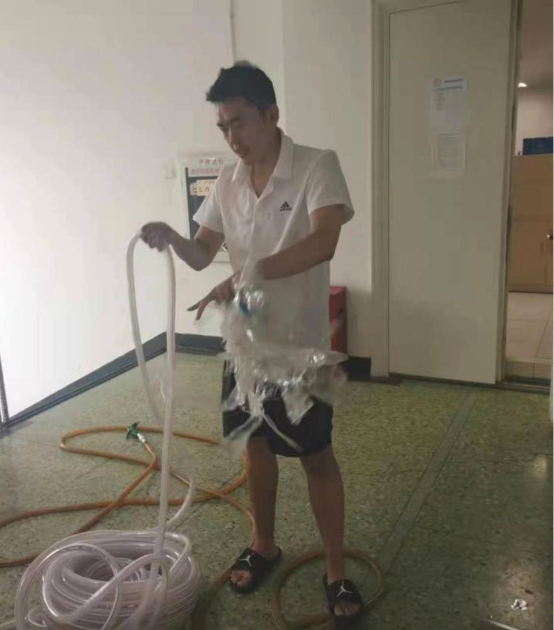 由于近期气温持续升高,有两个服务器机房的空调相继出现高压警报和停机情况,服务器机房的温度一度高达30多度。如不及时处理,存在空调停机、机器过热损毁的风险,影响师生使用计算集群。葛加可同学紧急采取扫帚扫和泼水等方法来清扫空调室外机,使得空调暂时恢复了运行。然而,22日中午,空调又出现了报警情况。居家办公的教职工紧急联系了学校后勤集团求助,在杨立伟部长协调下,后勤集团韩磊老师帮忙找来水管,和葛加可同学一起,顶着炎炎烈日,历时三个多小时,共计冲洗了位于房顶的5台空调室外机,最终化解了机房险情,谱写了一曲师生齐心协力,校内校外积极配合,共克时艰,保障服务器机房安全运行的佳话。